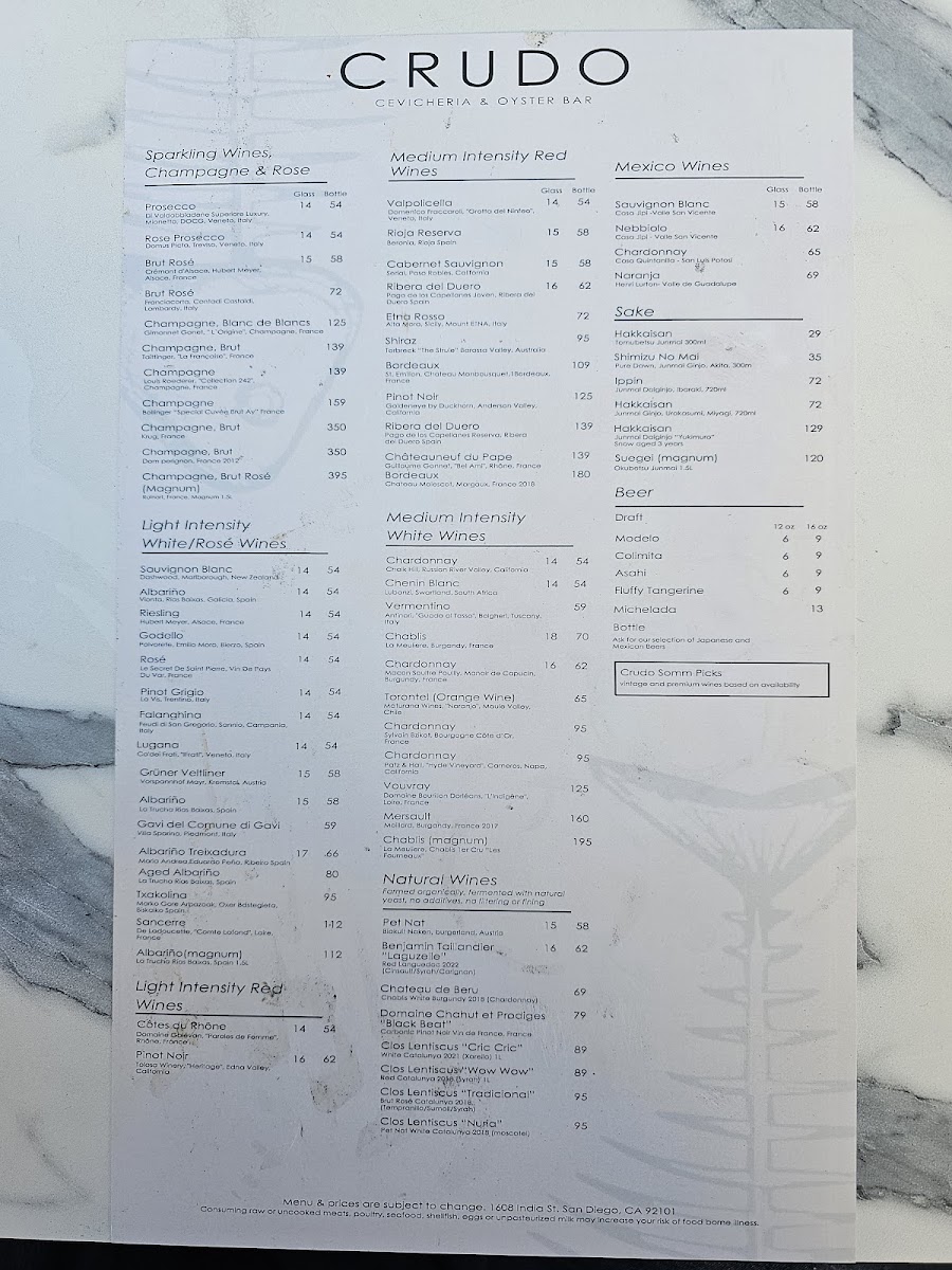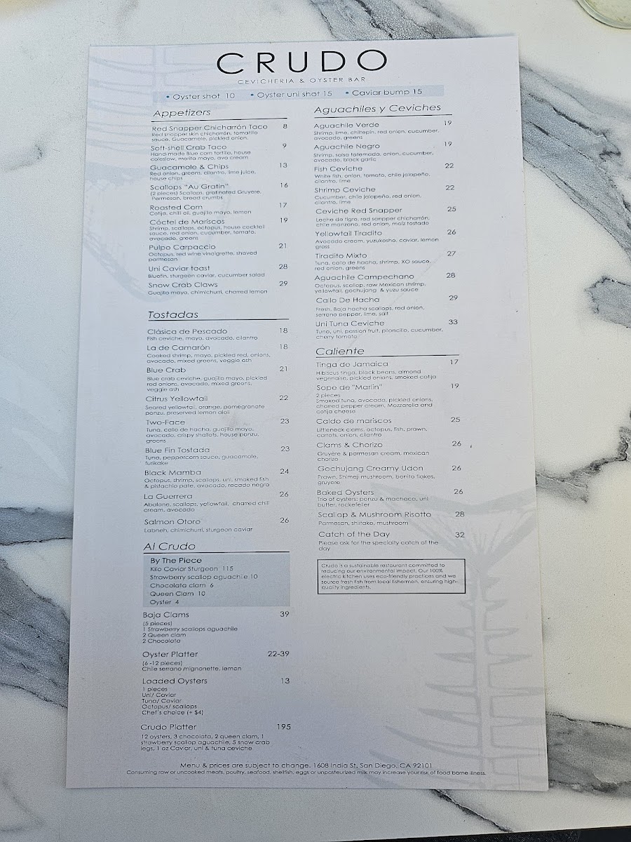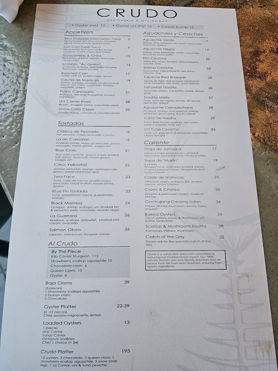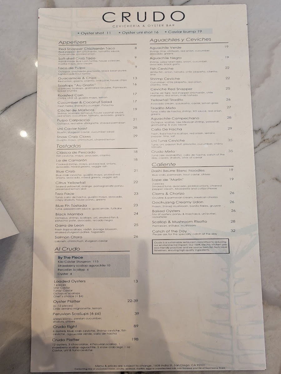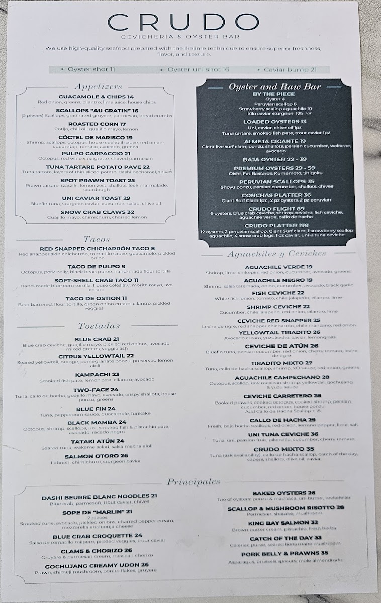Overall, Crudo Ceviche & Oyster Bar provides a fresh, exciting, and well-rounded menu perfect for anyone who loves seafood with a twist, making it a must-visit destination in San Diego.