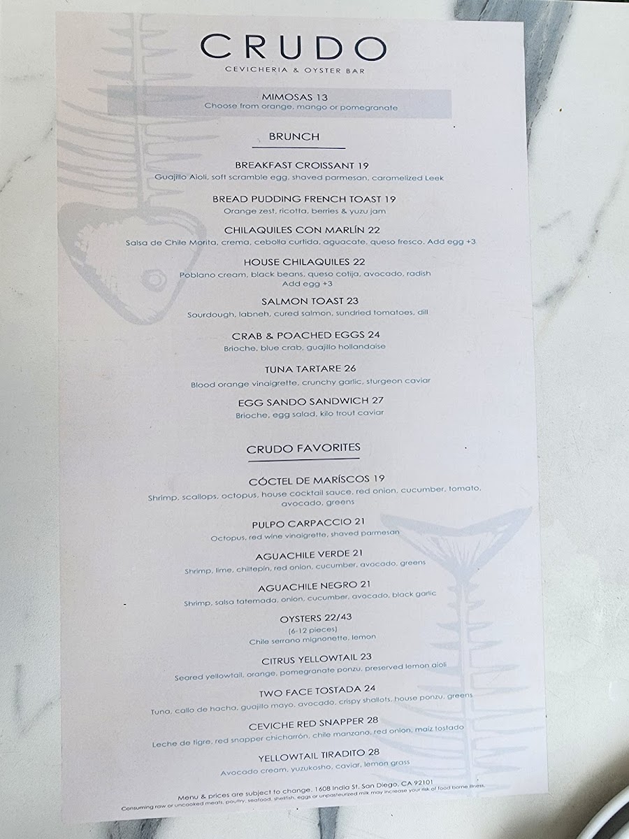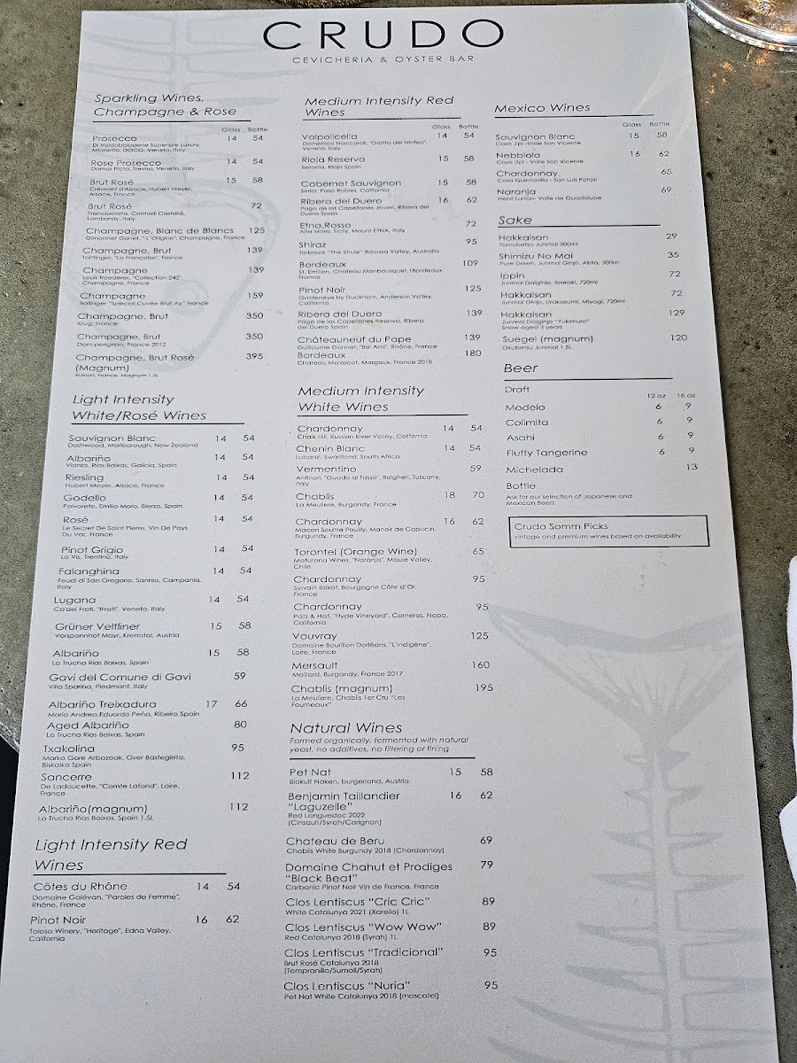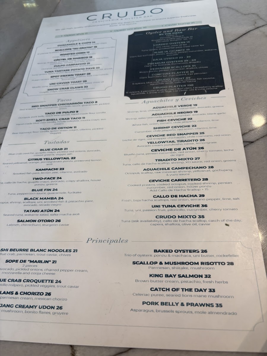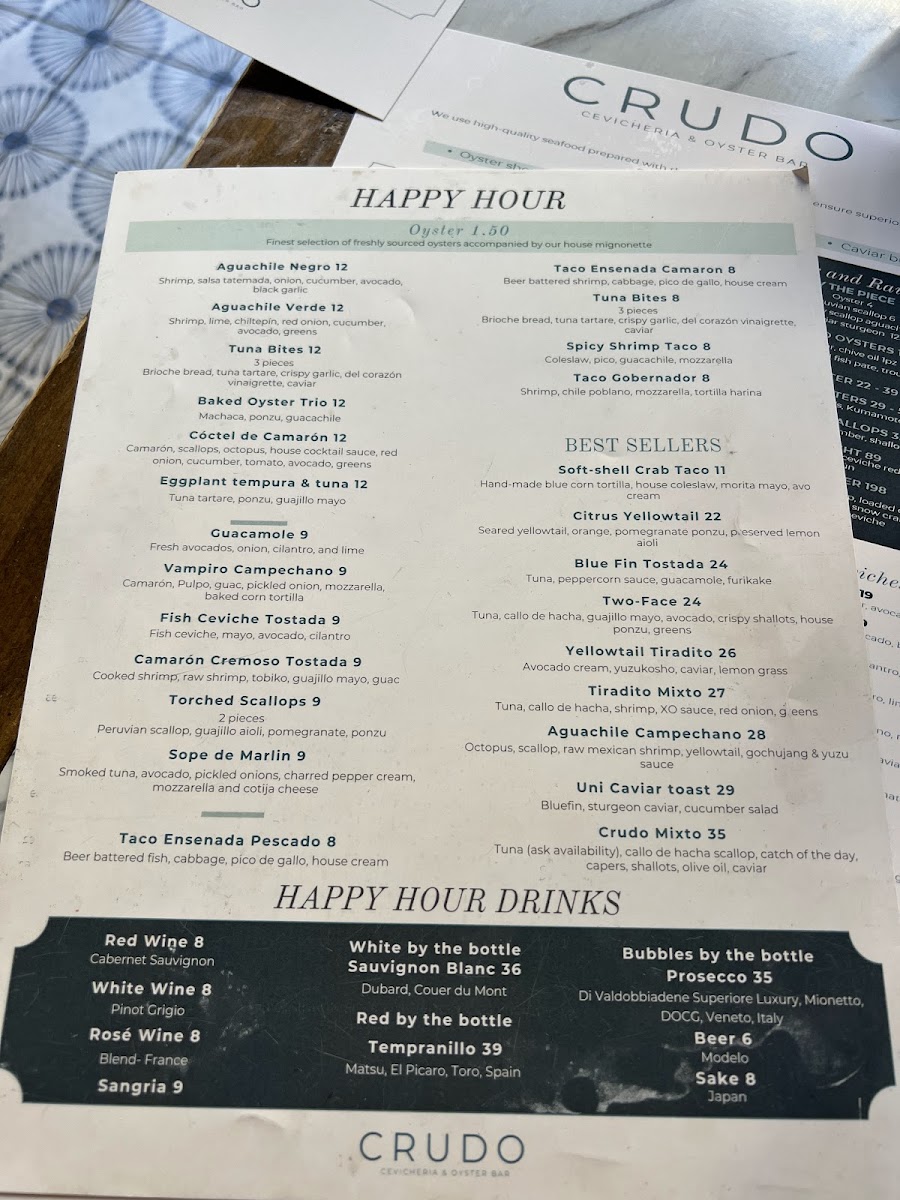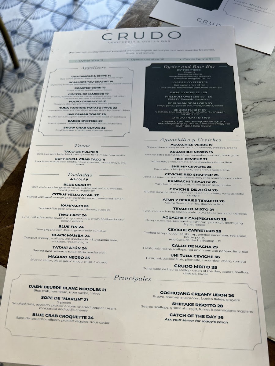 Overall, Crudo Ceviche & Oyster Bar provides a fresh, exciting, and well-rounded menu perfect for anyone who loves seafood with a twist, making it a must-visit destination in San Diego.